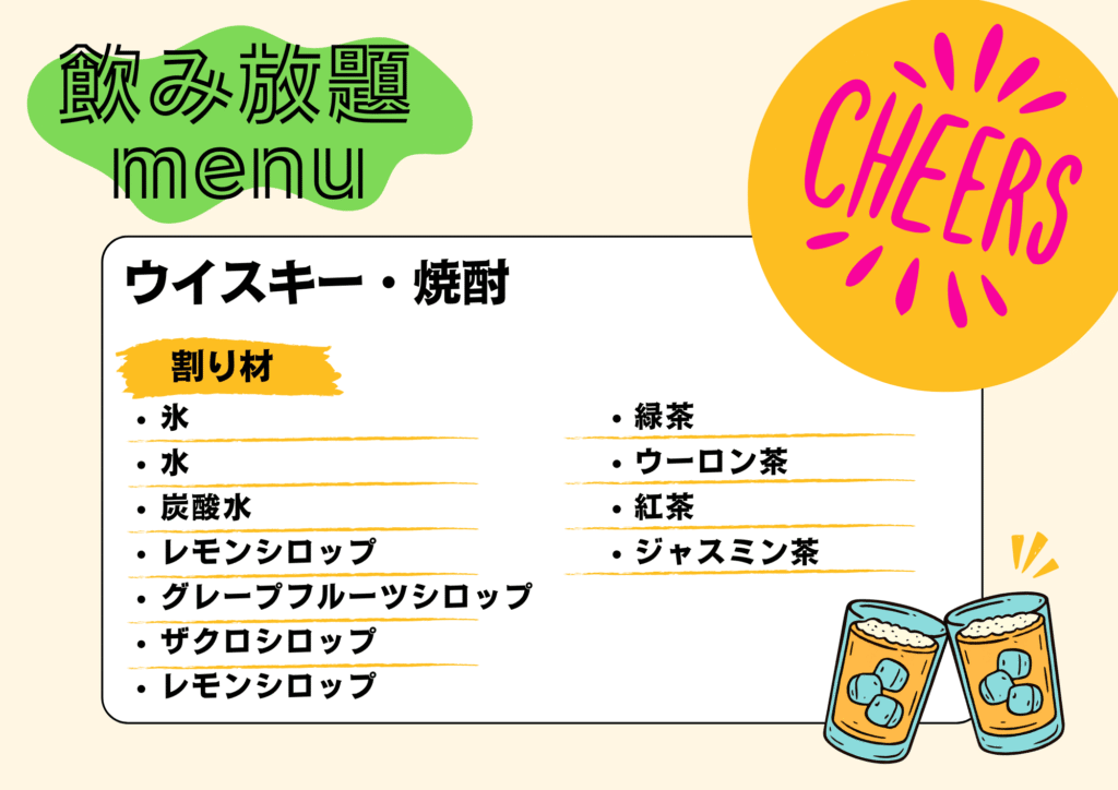 - スタッフが飲み放題ドリンクを作る場合 サービス料として1杯¥500(税別)